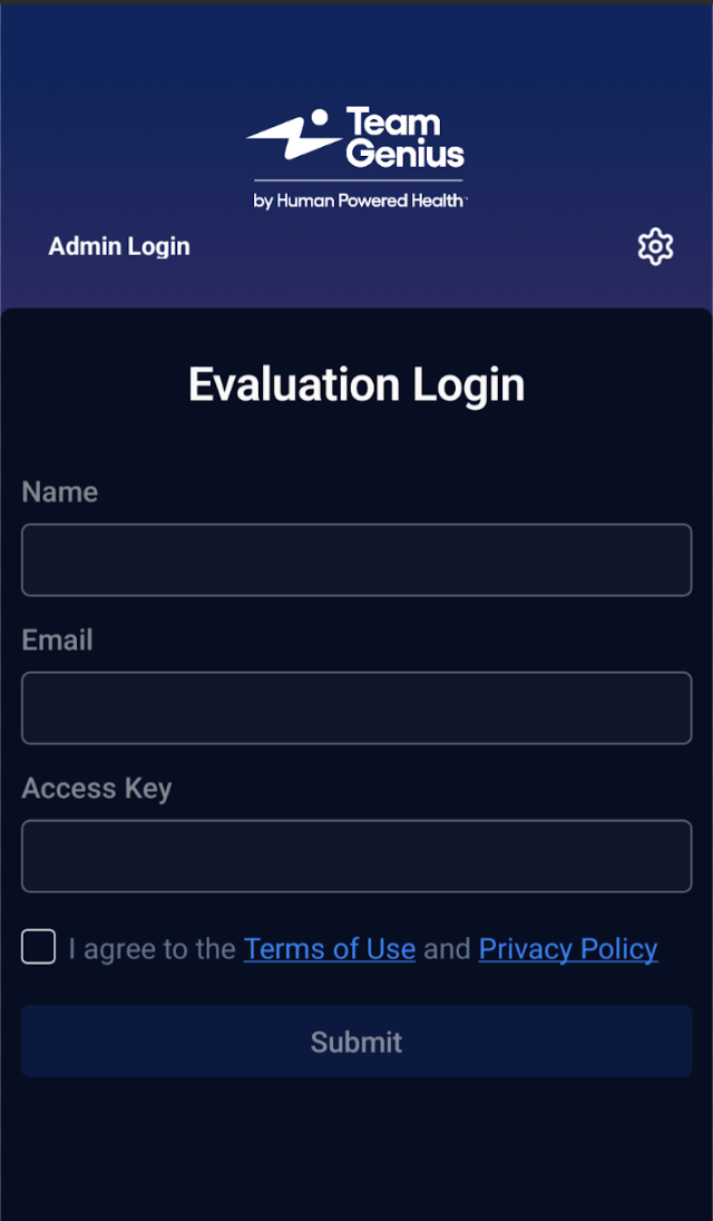 - Access Key - This is a unique key for the evaluation that will be provided to you by the association