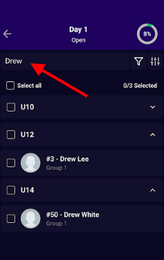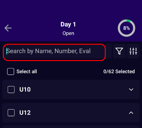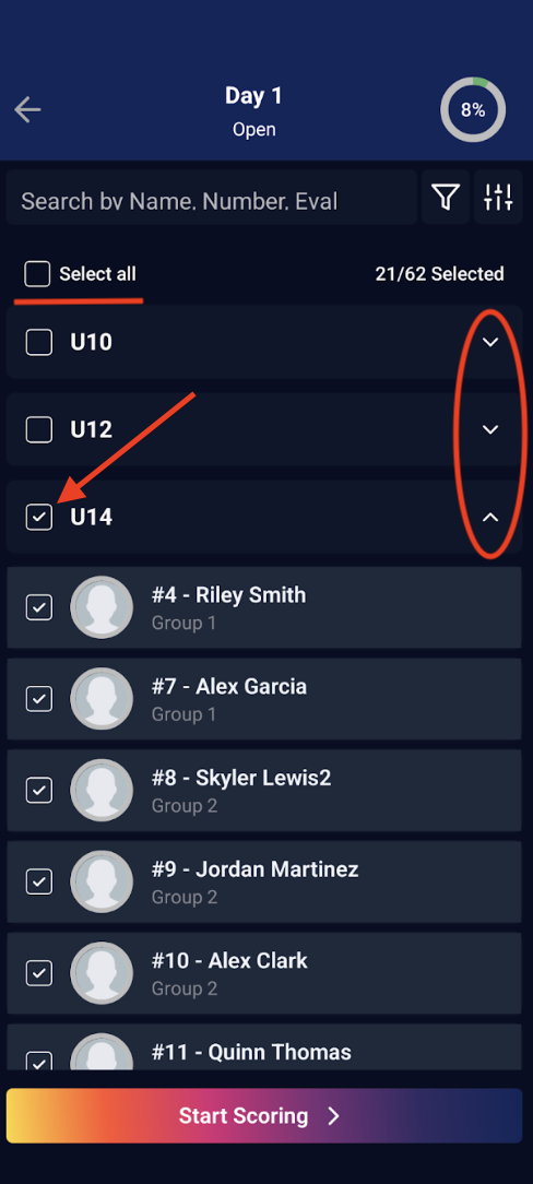 If you only need to score a few players vs all of the players in a Player Pool or Eval Group, you are able to use the Search bar at the top of the Player Selection page. Here you can search for a player by their Name or Number. You can also use the search bar to find any player with an Eval Group assigned to them by searching for the Eval Group name. Once you've found the player, check the box to the left of their name/number.