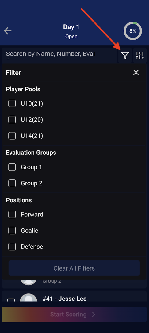If the Access Key you are using gives you the ability to score on more than one Player Pool, you'll see all of the available Player Pools expanded on the selection page. You can collapse each Player Pool by clicking the arrow to the right of the Player Pool name. Check the box to the left of the Player Pool name to select all of the players in that pool to score. You can also select all the players across all the available Player Pools by checking the "Select All" box. Clicking on the "Filter" icon to the right of the search bar will also show you the available Player Pools to select quickly.