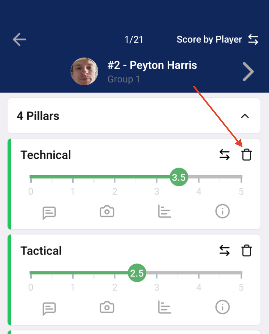 If you need to delete a score you've already recorded, you can do so by clicking the "trash can" icon to the right of the criteria name.