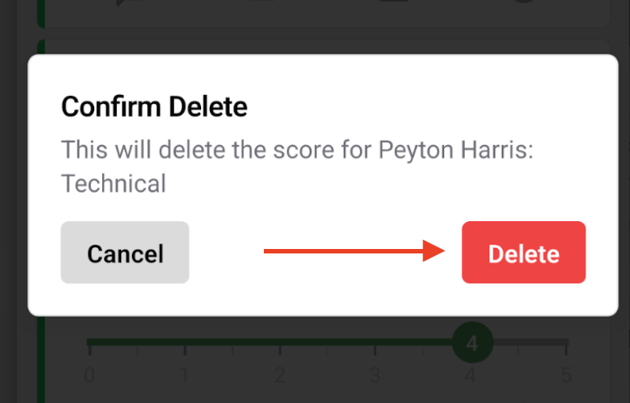 You'll see a pop up window that asks you to confirm you wish to delete the score. By clicking the red Delete button, you are removing the score from the system.